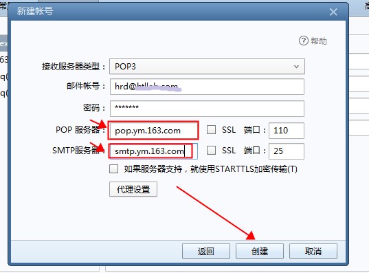 5、接上一步出现的界面,填写POP和SMTP服务器信息,再点击 创建 按钮。即可。见下图: