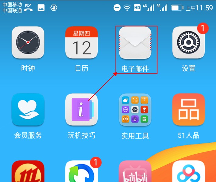 1、找到电子邮件图标,其他手机型号相似找一找,有些在设置里面。