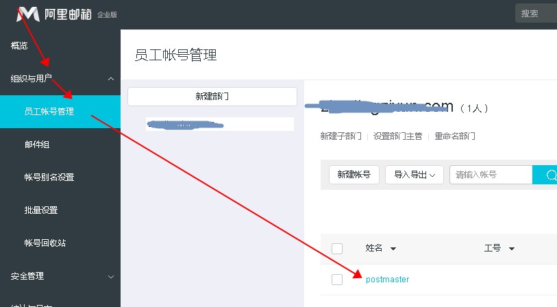 管理员添加邮箱号码:用管理员账号在上面的网址里登入:组织和用户——员工账号管理——新建账号,如下图所示:
